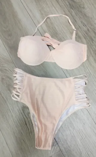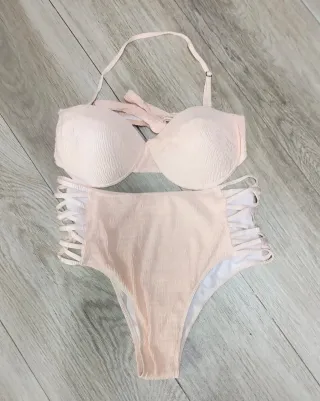 Costume da bagno due pezzi con un design moderno e femminile. - Tessuto testurizzato per un look unico. - Top con spalline regolabili e chiusura posteriore. - Slip a vita alta con dettagli incrociati sui fianchi.