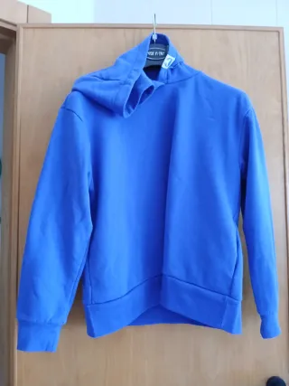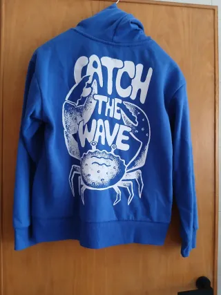Felpa con cappuccio e stampa sul retro. - Stampa Catch the Wave con un granchio. - Colore blu vivace. - Polsini e fondo a costine.