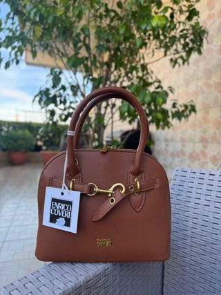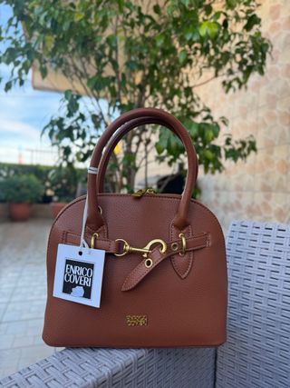 Elegante borsetta da donna Enrico Coveri. - Materiale similpelle texturizzato. - Dettagli metallici dorati. - Chiusura con zip e fibbia decorativa. - Manici superiori e tracolla regolabile.