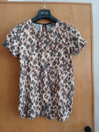 Maglia da donna con una vivace fantasia leopardata. - Maniche corte. - Scollo rotondo con dettaglio a goccia sul retro. - Orlo arrotondato.