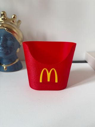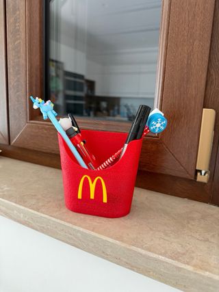 Portapenne a forma di sacchetto per patatine fritte, ispirato al design McDonald's. Un accessorio divertente e originale per la scrivania. - Colore rosso vivace. - Logo McDonald's giallo applicato sul fronte. - Design a forma di sacchetto per patatine.