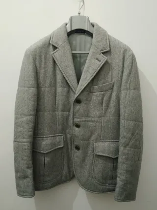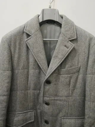 Elegante giubbotto da uomo dal taglio sartoriale. - Tessuto grigio mélange. - Chiusura a bottoni. - Tasche frontali con patta. - Dettagli trapuntati sulle maniche e sul busto.