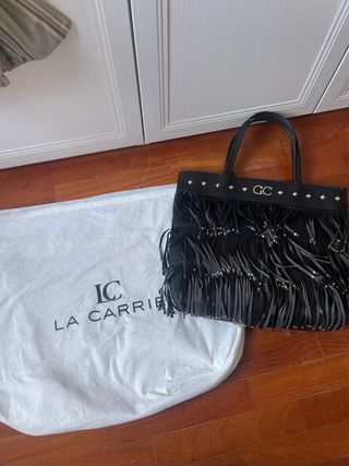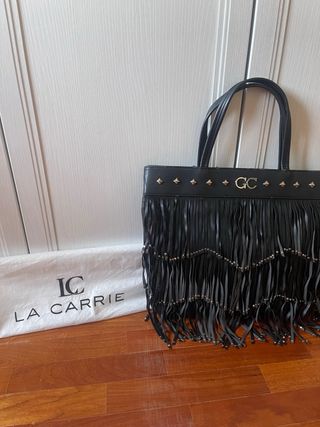 Elegante borsa La Carrie nera, un accessorio di tendenza con dettagli unici. - Design con frange decorative. - Logo GC applicato sul davanti. - Borchie decorative lungo il bordo superiore.