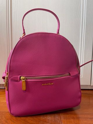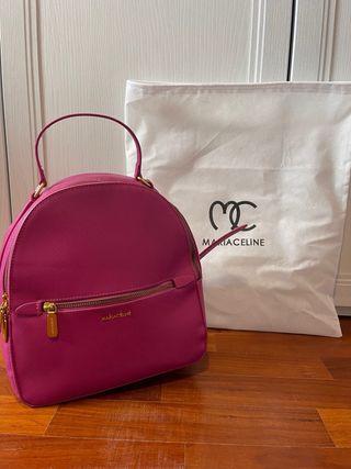 Zainetto Mariaceline di colore rosa acceso, con finiture dorate. - Logo Mariaceline sul davanti. - Tasca esterna con zip. - Manico superiore e spallacci regolabili.