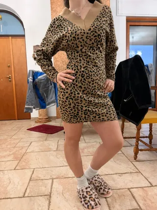Vestito corto con stampa animalier. - Scollo a V. - Maniche lunghe. - Lunghezza sopra il ginocchio.