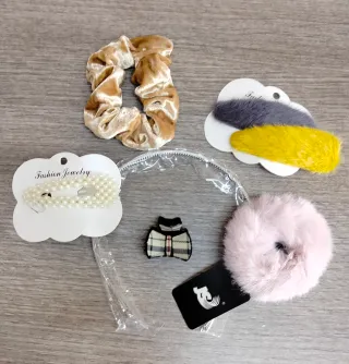 Set composto da 7 accessori per capelli, tra cui scrunchies e fermagli. - Fermaglio con perle. - Fermagli in pelo grigio e giallo. - Cerchietto trasparente con fiocco. - Due scrunchies in tessuto color oro. - Uno scrunchie rosa in pelo.