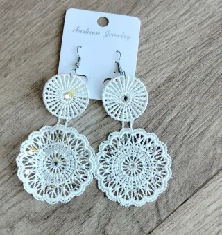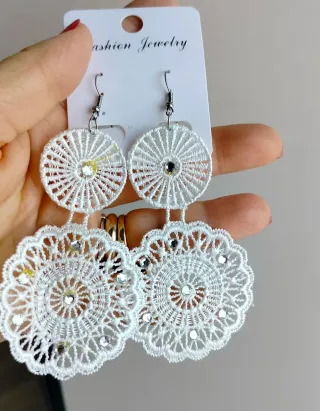 Delicati orecchini in pizzo bianco, perfetti per aggiungere un tocco di eleganza. - Design rotondo in pizzo. - Dettagli con strass scintillanti. - Chiusura a monachella.