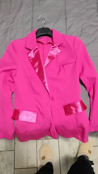 Elegante giacca da donna con un vivace colore fucsia e dettagli in raso lucido. - Rever in raso. - Tasche con inserti in raso. - Chiusura con un bottone.