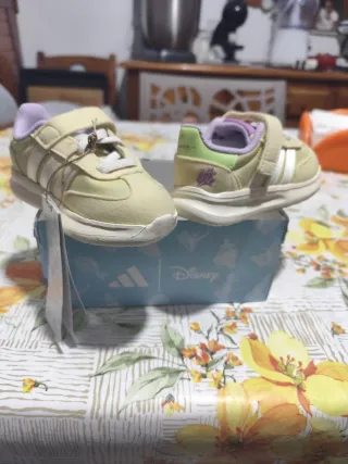 Scarpe da bambina Adidas, modello Disney. - Colore giallo tenue con dettagli viola e verdi. - Chiusura a strappo. - Logo Adidas e personaggio Disney sul lato.