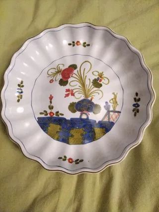Piatto in maiolica con decorazioni floreali e motivi geometrici. - Bordo ondulato con finitura dorata. - Motivo centrale con fiori e fogliame. - Decorazioni laterali con piccoli fiori.