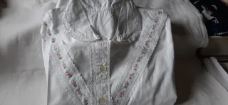 Camicia da notte vintage con dettagli ricamati, con maniche lunghe in puro cotone. - Colletto rotondo con bordo in pizzo. - Apertura frontale con bottoni. - Inserti in pizzo con ricami di rose lungo la scollatura. Misure spalle 50 cm, ascelle 63 cm, lunghezza 110 cm.