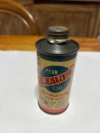 Lattina vuota , conteneva olio antiruggine Penn Maine per armi, creata dall’industria lubrificanti Rodolfo Pierpaoli di Fano Il contenuto era Ideale per la protezione delle armi. - Aiutava anche a rimuovere i residui di polvere da sparo. Serviva per mantenere l’arma in perfetta conservazione ed efficienza. Ottima per allestire la vetrinetta dei piaceri!
