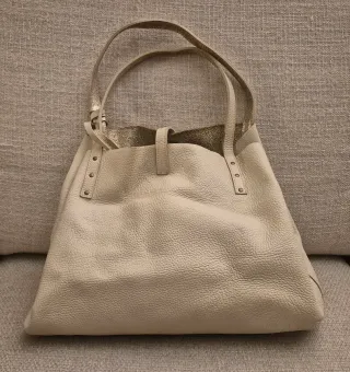 Borsa donna Jacky & Celine. Colore esterno bianco panna. Colore interno dorato. Borsa in pelle. Interno in poliestere. Borsa provvista di 2 manici. Astuccio interno con chiusura a cerniera. Custodia antipolvere inclusa.