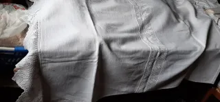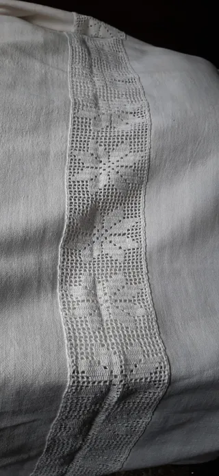 Elegante telo con lavorazione di intarsi e bordi laterali all'uncinetto, perfetto come tovaglia o copriletto. - Misure: 215x175 cm - Dettagli in pizzo all'uncinetto sui bordi. Ultima foto evidenziata una piccola macchiolina che sparirà con un lavaggio di rinfresco.
