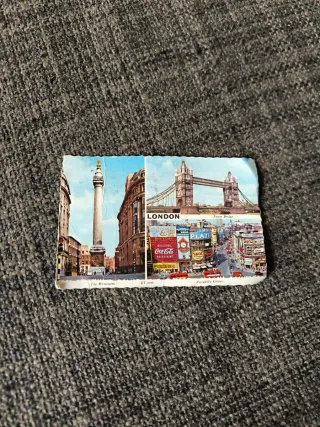 Cartolina vintage di Londra del 1968. - Raffigura Tower Bridge e Piccadilly Circus. - Scena con il Monumento. - con francobollo 4 pence regina Elisabetta