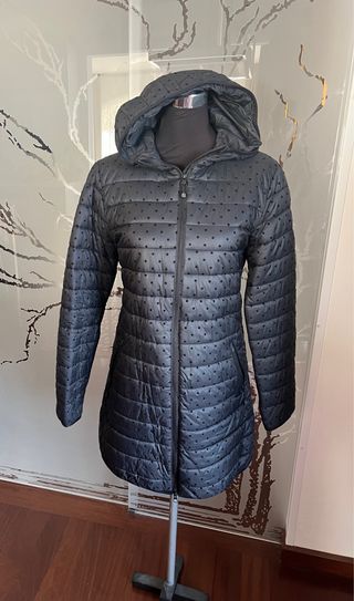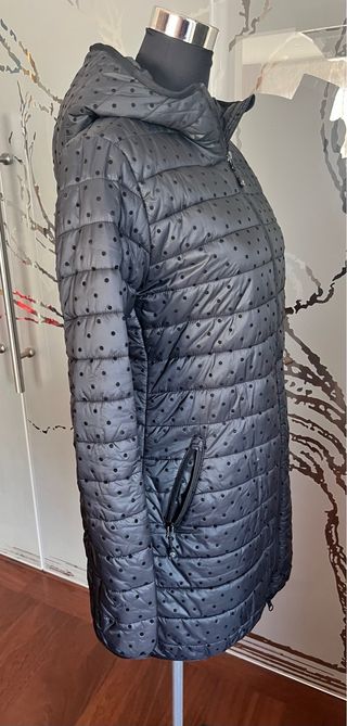 Piumino lungo nero sfondo pois North Sails, taglia M, cappuccio fisso, tasche laterali. Leggero ma caldissimo con imbottitura in thermolite. In pertetto stato : esattamente come nuovo.