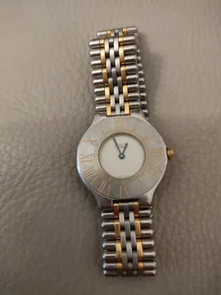 Elegante orologio da uomo Cartier Must 21, con un design bicolore che unisce l'oro all'argento. Un accessorio classico e raffinato. - Quadrante con numeri romani. - Bracciale in acciaio e inserti dorati.