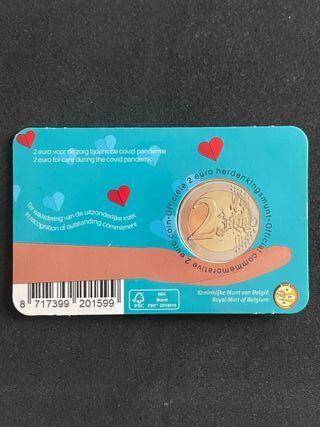 Moneta commemorativa 2 Euro Belgio 2022 in confezione FDC. - Riconoscimento per l'impegno durante la pandemia di COVID-19. - Design speciale con mani che offrono cuori. - Include testo in francese, olandese e tedesco. - FDC zecca francese tiratura di questa coincard 75.000 pz