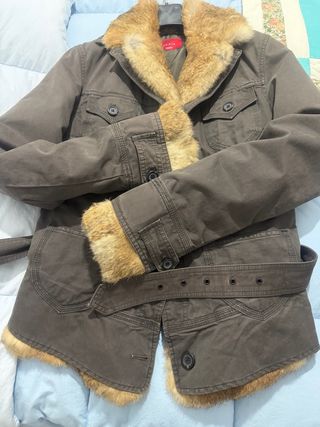 Elegante giacca Conbipel in ottime condizioni, perfetta per aggiungere un tocco di stile. - Dettagli in pelo sul collo e sui polsini. - Cintura in vita per una vestibilità personalizzata. - Tasche frontali con chiusura a bottone. - Chiusura frontale con bottoni. - leggera imbottitura staccabile