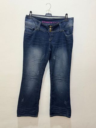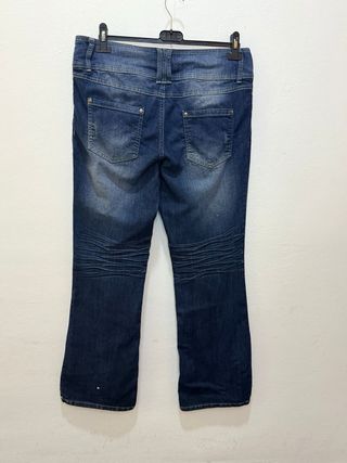 Jeans da donna in denim blu. - Vita alta con chiusura a bottoni. - Effetto used e dettagli a costine sulle gambe. - Gamba svasata.