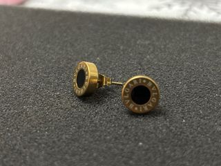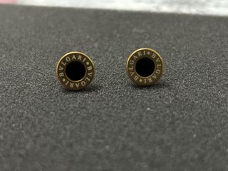 Eleganti orecchini Bvlgari con un design distintivo. - Cerchio esterno con logo inciso. - Inserti centrali neri lucidi.