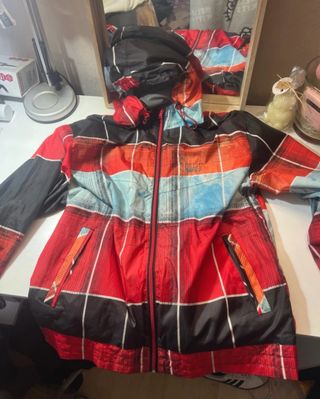 Giacca a vento/pioggia con un design a quadri vivace. Perfetta per proteggersi dalle intemperie con stile. - Fantasia a quadri multicolore. - Cappuccio integrato. - Zip frontale. - Tasche laterali.