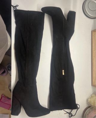 Eleganti stivali alti fino al ginocchio. - Materiale scamosciato. - Tacco largo e comodo. - Zip laterale per facilitare la calzata. - Lacci regolabili sul polpaccio.