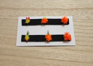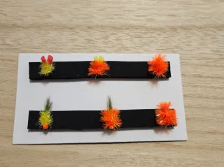 Set di mosche artificiali per la pesca in lago. - Mosche con colori vivaci. - costruite su ami senza ardiglione del 10 - Costruite artigianalmente. - 4 galleggianti. -2 affondanti.