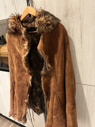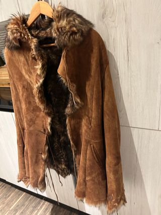 Elegante giacca in montone con dettagli in pelliccia. - Materiale esterno in montone scamosciato. - Fodera interna in pelliccia sintetica. - Collo e bordi con pelliccia. - Chiusura con lacci. - Tasche applicate.