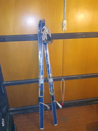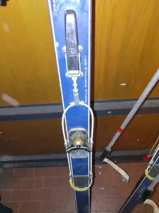 Set di sci vintage Lamborghini aliante in frassino stratificato con bacchette - Sci blu con attacchi. - Bacchette con impugnatura.