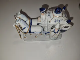 Deliziosa statuina in porcellana raffigurante una carrozza trainata da due cavalli, con figure umane. - Dettagli in blu e oro. - Base in porcellana bianca. Perfetta