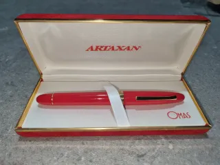Elegante penna stilografica Omas Artaxan, presentata nella sua confezione originale. - Colore: rosso brillante. - Dettagli in oro. - Marchio Omas visibile sulla confezione. Senza garanzia