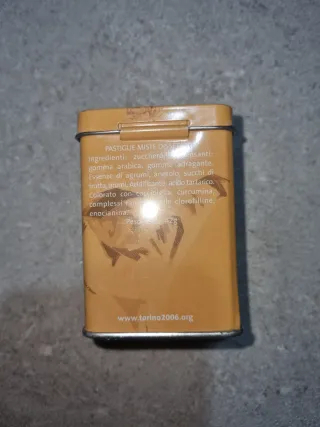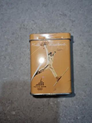 Barattolo di latta commemorativo delle Olimpiadi Invernali di Torino 2006. - Raffigura uno sciatore in azione. - Presenta il logo torino 2006 e i cerchi olimpici. - Design colorato su sfondo ocra.