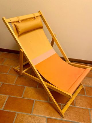 Comoda sdraio con struttura in legno e seduta in tessuto. - Design moderno e funzionale. - Tonalità vivaci che richiamano l'estate. - Ideale per rilassarsi all'aperto.