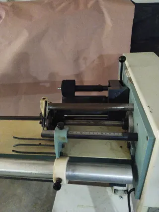 Macchina industriale per tagliare nastri di tessuto. Ideale per laboratori tessili. Include pedale. Pannello di controllo con pulsanti di arresto e avviamento.
