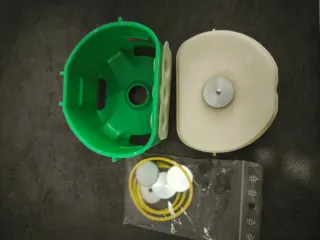 Mufla in plastica per duplicare gesso, marca Mestra. - Materiale: Plastica trasparente e base blu. - Coperchio in plastica liscio. Dimensioni grandi.