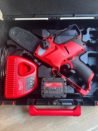 Tagliasiepi senza fili Milwaukee M12, leggero e facile da maneggiare, ideale per lavori di potatura e giardinaggio. Include 1 batteria, caricabatterie M12 completamente nuovo, barra con lama da 15 cm (6") con lubrificazione automatica e valigetta di trasporto. Macchina e batteria in buono stato di funzionamento; caricabatterie completamente nuovo.