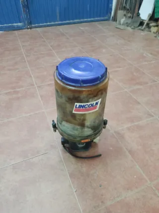 Pompa di lubrificazione automatica Lincoln con serbatoio. - Serbatoio in plastica trasparente. - Coperchio blu. - Connessioni laterali. - Tre iniettori.