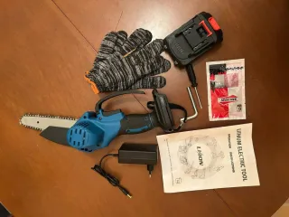 Mini motosega elettrica portatile, ideale per lavori di giardinaggio e potatura. Include batteria al litio, caricatore, catena di ricambio, guanti protettivi, strumenti per montaggio e regolazione, manuale di istruzioni.