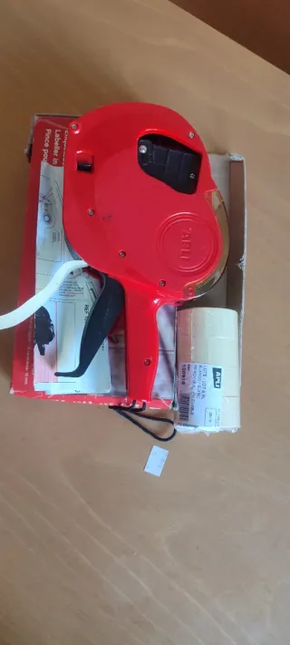 Vendo etichettatrice manuale Apli modello 101419, in buone condizioni e funzionante, con confezione di rotoli di etichette extra, colore rosso, con la sua scatola e documenti.