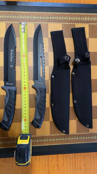 Set di due coltelli da campo Rebelion con fodere. - Coltello Rebelion - 11 con lama seghettata. - Coltello Rebelion - 1 con lama dentata. - Fodere in nylon nere incluse.