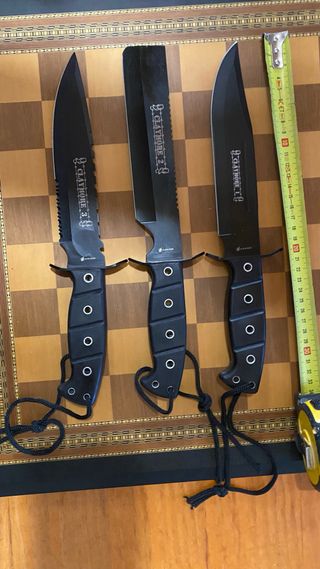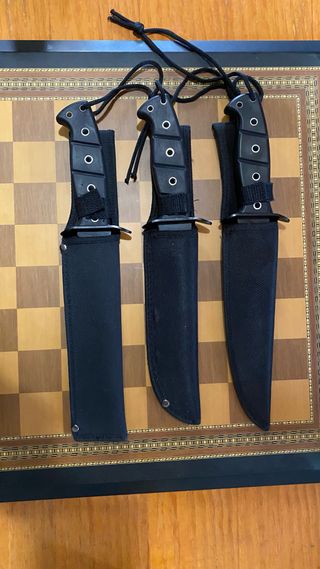 Set di tre coltelli da campo con manici neri e fodere abbinate. Ideali per attività all'aperto. - Tre coltelli inclusi. - Manici con rivetti. - Fodere in nylon con chiusura.