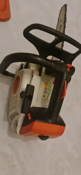 La motosega Stihl modello MS 170 funziona perfettamente, quasi nuova. Colore arancione e bianco. Include fodera protettiva per la lama.