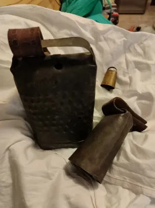 Cencerri metallici autentici: - Cencerro grande di metallo con manico in pelle, senza clic e due fori, ma è possibile inserire una barra metallica. 5€ - Cencerro mediano in ottone. 5€ - Cencerro piccolo in metallo. 3€. I tre 10€