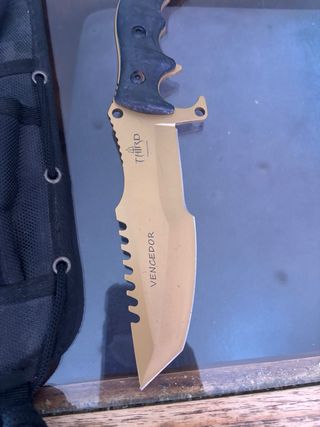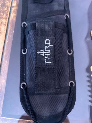 Coltello della marca Third con il suo fodero. - Fodero in nylon resistente. - Chiusura con velcro e cordino. - Occhielli metallici per il fissaggio.