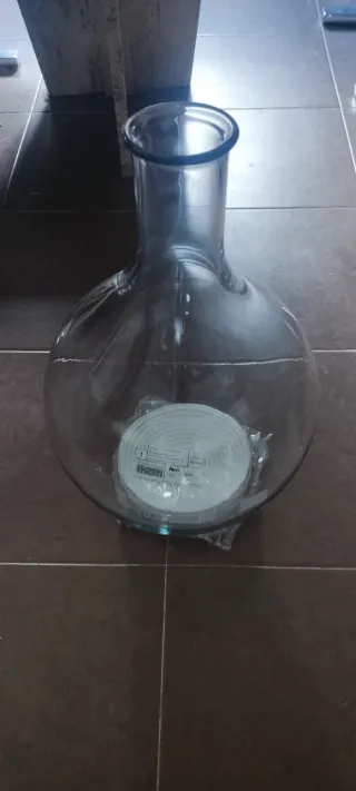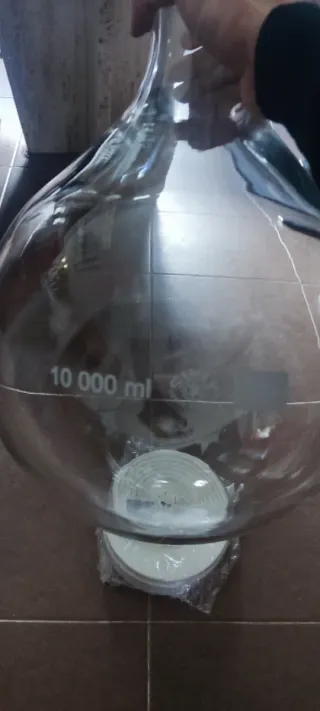 Matraz di laboratorio in vetro con un design sferico e collo stretto. Ideale per esperimenti e miscele. Materiale: vetro trasparente. Forma: sferica con collo cilindrico. Resistente alle alte temperature. Include base di supporto.