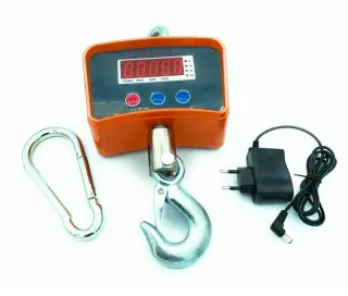 Bilancia dinamometro digitale per gru con capacità massima di 1000 kg. Ideale per pesate precise. - Display digitale a LED rossi. - Gancio robusto in metallo. - Include moschettone in metallo. - Alimentatore incluso.