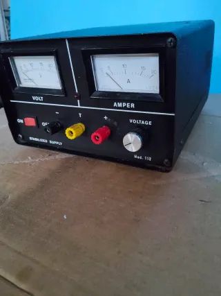 Alimentatore stabilizzato con voltaggio regolabile. Device come da foto, funzionante. Segnalo 2 fori sul mantello superiore e qualche piccola traccia di ruggine. - Range di tensione: 6-17V - Corrente: 12/15A - Modello: 112