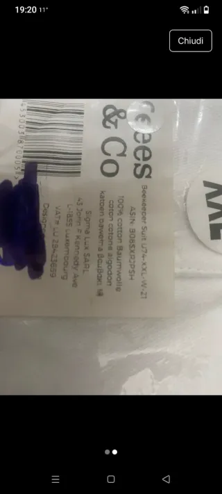 Giacca da apicoltore marca Bees & Co, taglia XXL. - Colore bianco. - Chiusura con cerniera frontale. - Tasche applicate sul davanti.