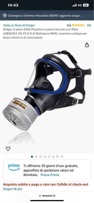 Prezzo shock...VERO AFFARE!! Maschera a pieno facciale Dräger X-plore 6300 con filtro A2B2E2K2 HG P3 R D. - Filtro con filettatura Rd40. - Ideale per lavori chimici e di costruzione. soltanto aperta ma non utilizzata , completa di filtro nuovo ,sigillato. A seconda del filtro che si applica si puo’ utilizzare in vari settori (radioattivi, petroliferi, minerari, vernici, concimi , softair , paintball ecc..) NB: La patina bianca che vedete non e’ polvere o sporco, ma e’ un film protettivo igenizzante.